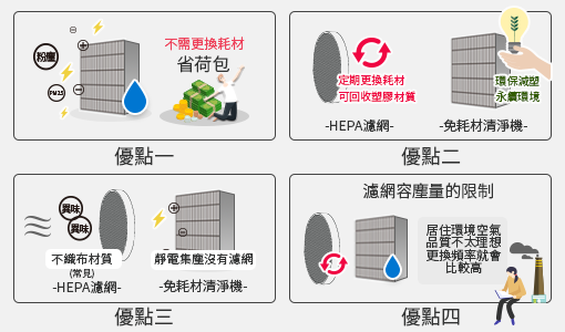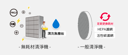 無耗材的清淨機是透過靜電吸附空氣中的髒污到集塵板中,只要清洗集塵板就可以一直使用下去,所以稱為「免耗材清淨機」。而一般清淨機使用的HEPA濾網、活性碳濾網,因為無法重複清理再運用,所以就必須定期更換耗材。