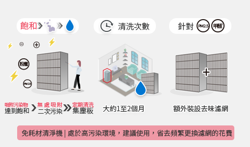 ① 取代耗材更換的就是要定期清洗集塵板,集塵板吸附污染物達到飽和後,無處再吸附就會飄散出來,造成二次污染。