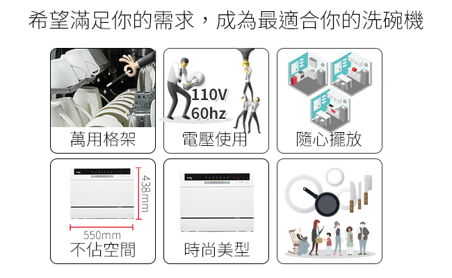 .現今台灣普遍是核心家庭,一家人口數落在3-4人,6人份的洗碗機完全剛好適用!如果有比較大型的鍋具,也可考慮8人份的機型!