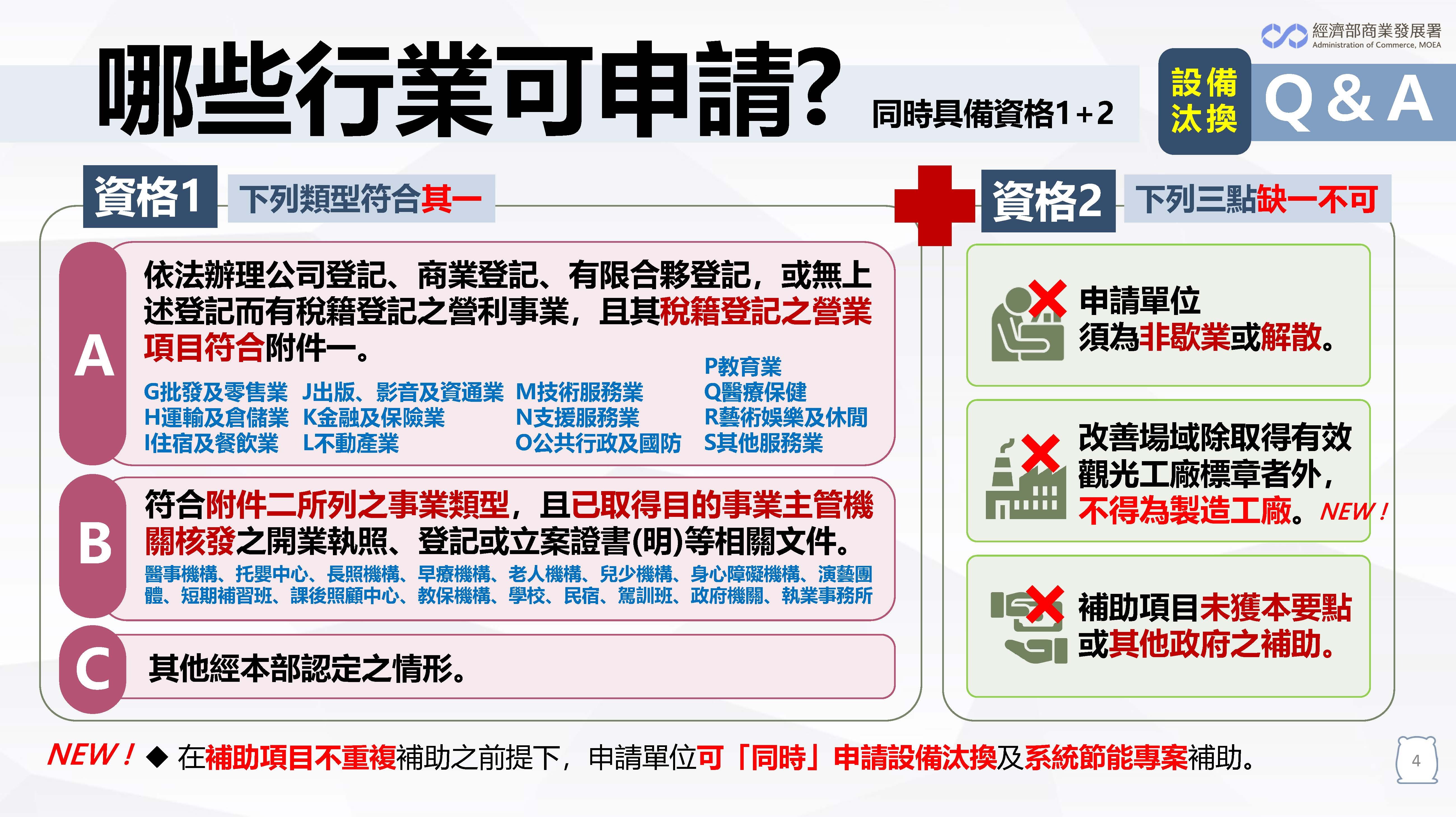 2024年2月起經濟部商業發展署投入10億元,提供商業服務業汰換節能設備補助,符合一級能源效率或節能標章之指定品項,即可申請補助,每一申請單位補助以50萬元為限。