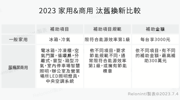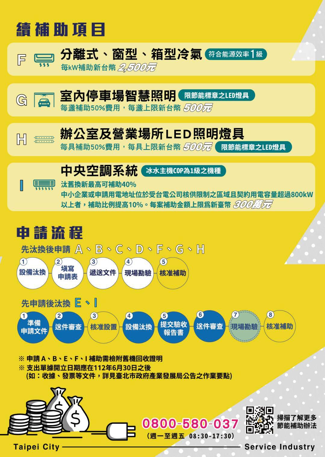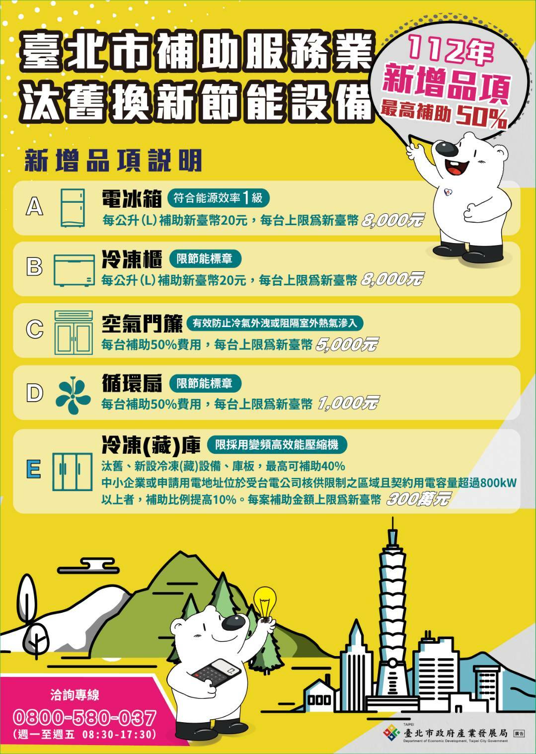 臺北市政府產業發展局近期修訂〈臺北市服務業汰換節能設備補助要點〉,原補助項目為辦公室照明、室內停車場智慧照明、冷氣空調、中央空調,本次修訂新增「電冰箱、冷凍櫃、空氣門簾、循環扇及冷凍(藏)庫」等補助品項,且調整中央空調系統每案補助上限,由每案200萬元提高為300萬元。