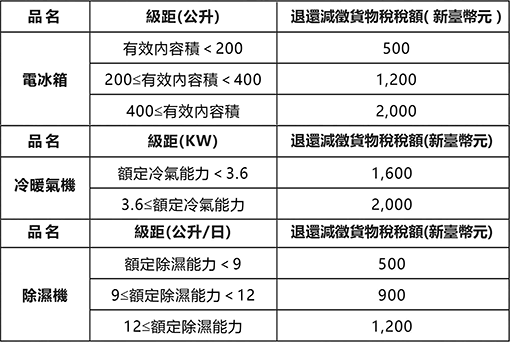 《貨物稅條例》增訂第11條之1,在條文生效日起2年內,購買經濟部核定能源效率分級為第1級或第2級之新電冰箱、新冷暖氣機或新除濕機,非供銷售且未退貨或換貨者,該等貨物應徵之貨物稅每臺減徵稅額以新臺幣(下同)2000元為限。並按電冰箱冷暖氣機除濕機減徵貨物稅稅額表(下稱減徵貨物稅稅額表)規定減徵之;減徵貨物稅應由消費者申請退還;減徵貨物稅稅額表及減徵貨物稅申請期限等相關事項之辦法,由財政部會同經濟部定之。