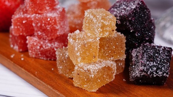 8. 冷卻後的軟糖表面撒上砂糖脫模,切成適當方塊大小,裹上糖粉,完成。