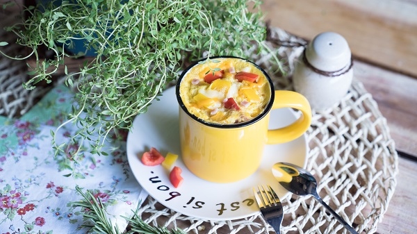 蛋2顆,牛奶2大匙,甜椒1/4顆,火腿2片,乳酪絲適量,鹽適量,黑胡椒粉適量