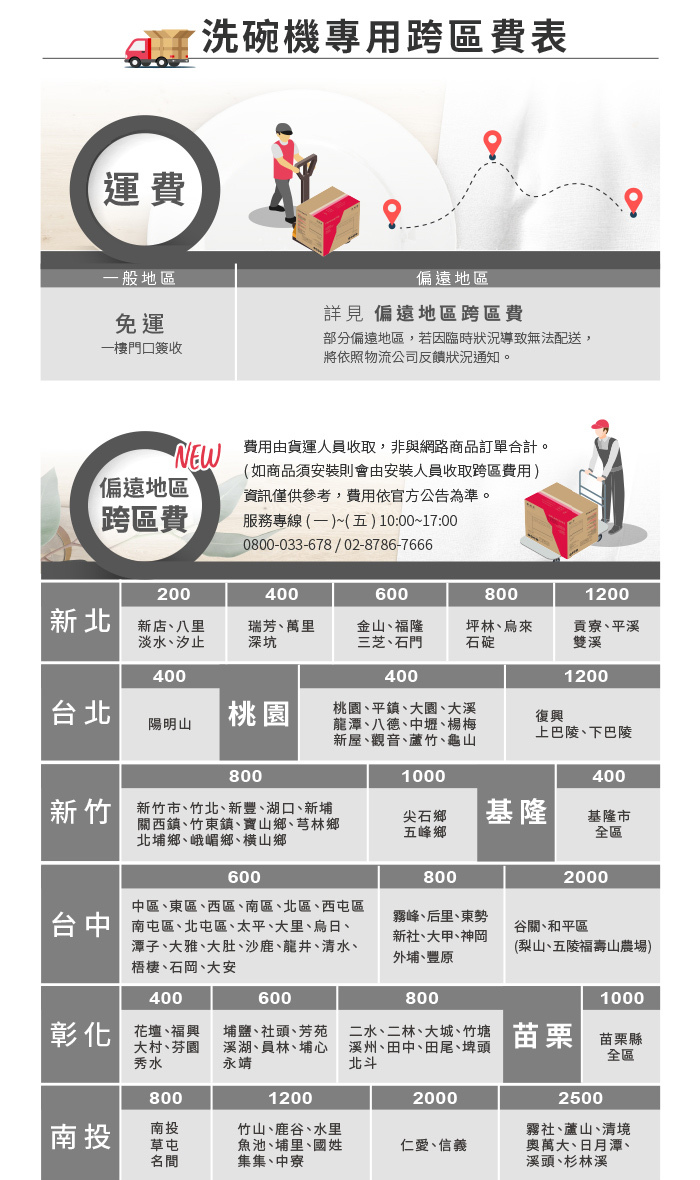 洗碗機跨區費用如下 (詳細請看該商品說明頁面)