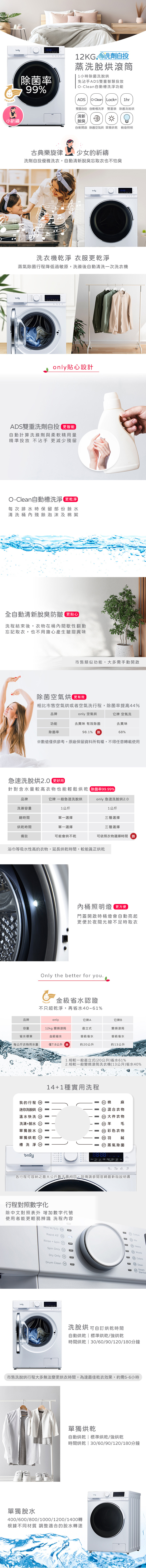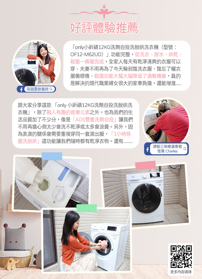 【10/24-11/26 雙11助興】贈DC變頻小縫扇~only小祈禱12KG洗劑自投洗脫烘洗衣機OF12-M62UD白(省水12公斤變頻滾筒 贈品市價$1990)