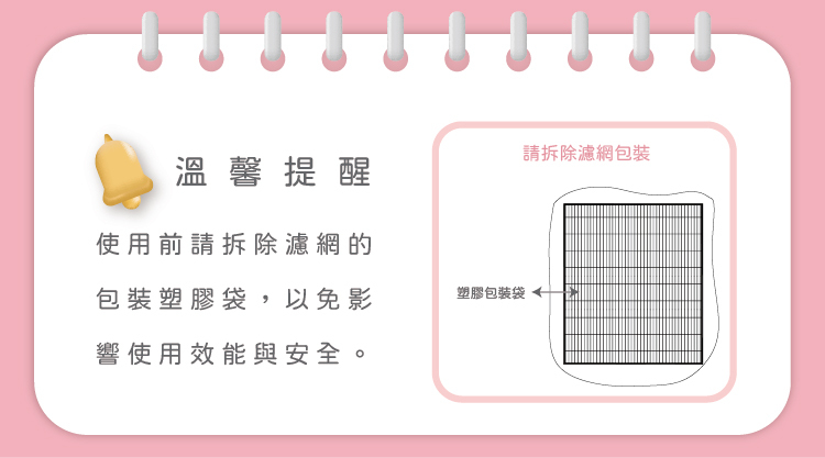 8.使用前,請先拆除濾網的包裝塑膠袋,以免影響使用效能與安全。