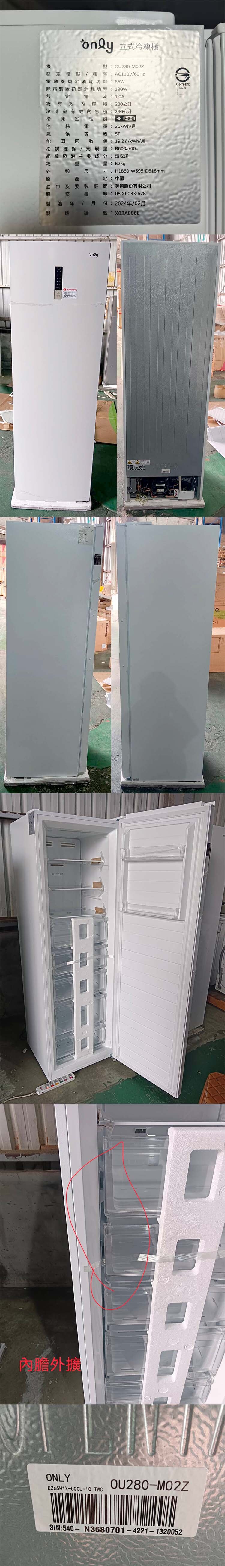 【凹傷品特賣會】only節能進化280L無霜冷凍櫃OU280-M02Z簡約白(比變頻更省電/節能標章)(序號: X02A0068)