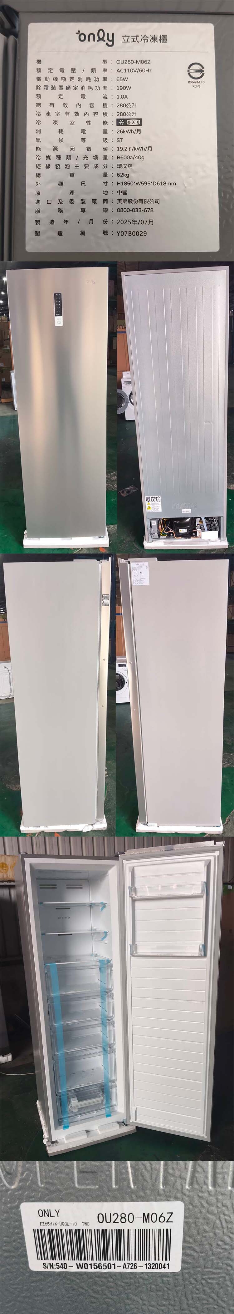 【凹傷品特賣會】only節能進化280L無霜冷凍櫃OU280-M06Z質感銀(序號: Y07B0029)